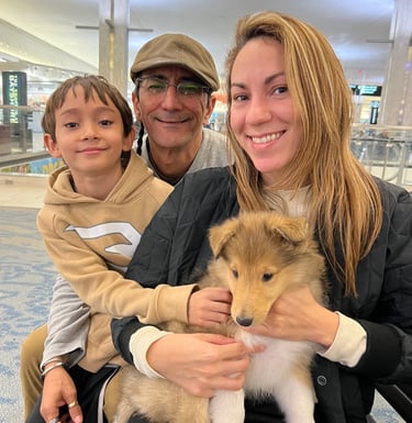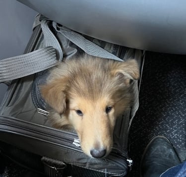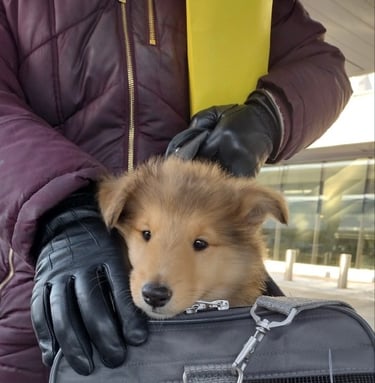 Come to my location, we can discuss meeting options to save distance or look at ground travel, as well as pups are allowed to fly in the cabin of a plane!